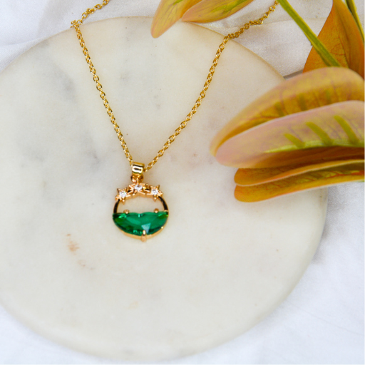 Half‑moon crystal pendant crowned with tiny stars on a gold‑tone chain. Available in Clear, Green, Pink, and Blue.