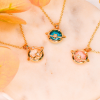 Half‑moon crystal pendant crowned with tiny stars on a gold‑tone chain. Available in Clear, Green, Pink, and Blue.