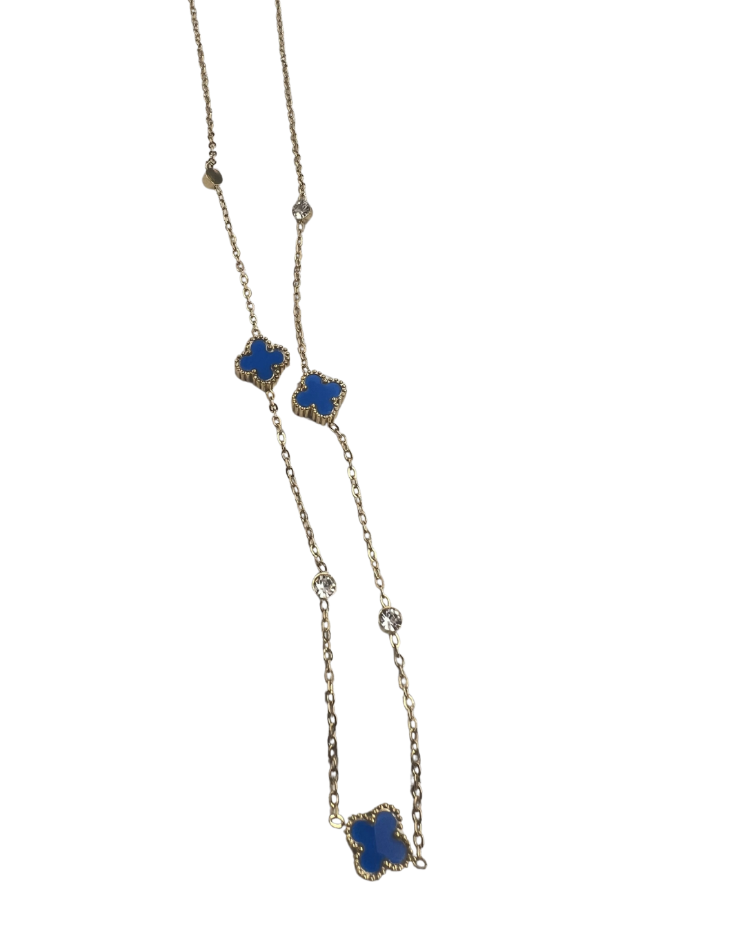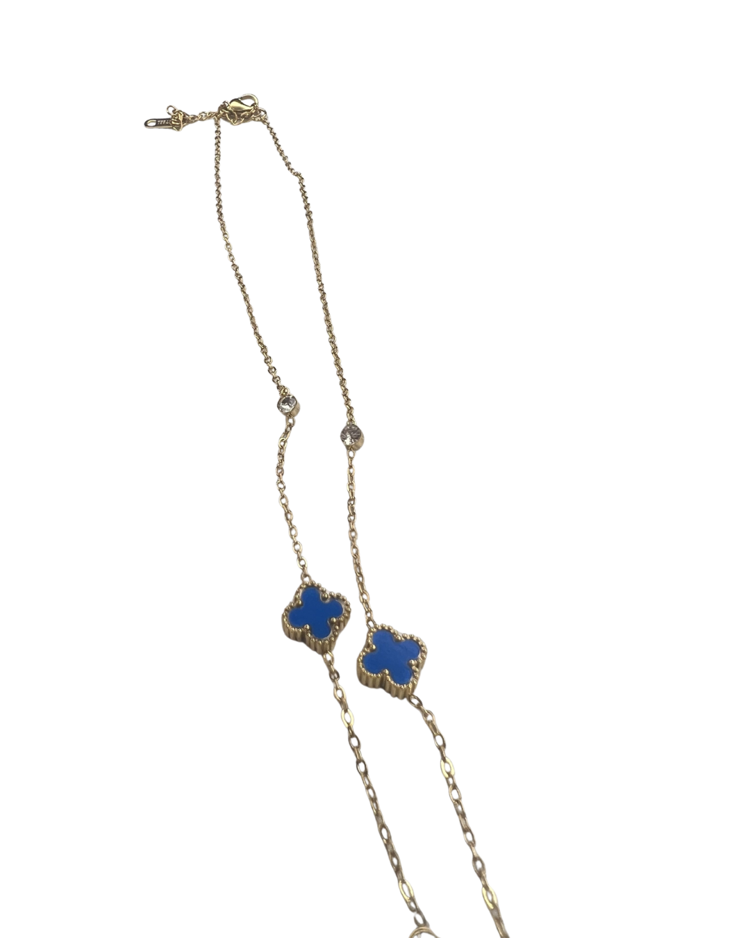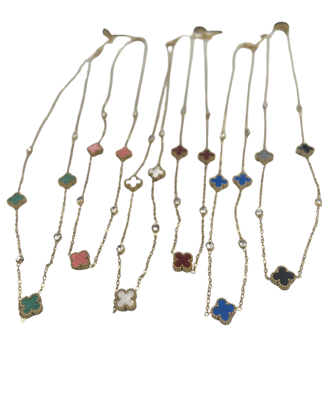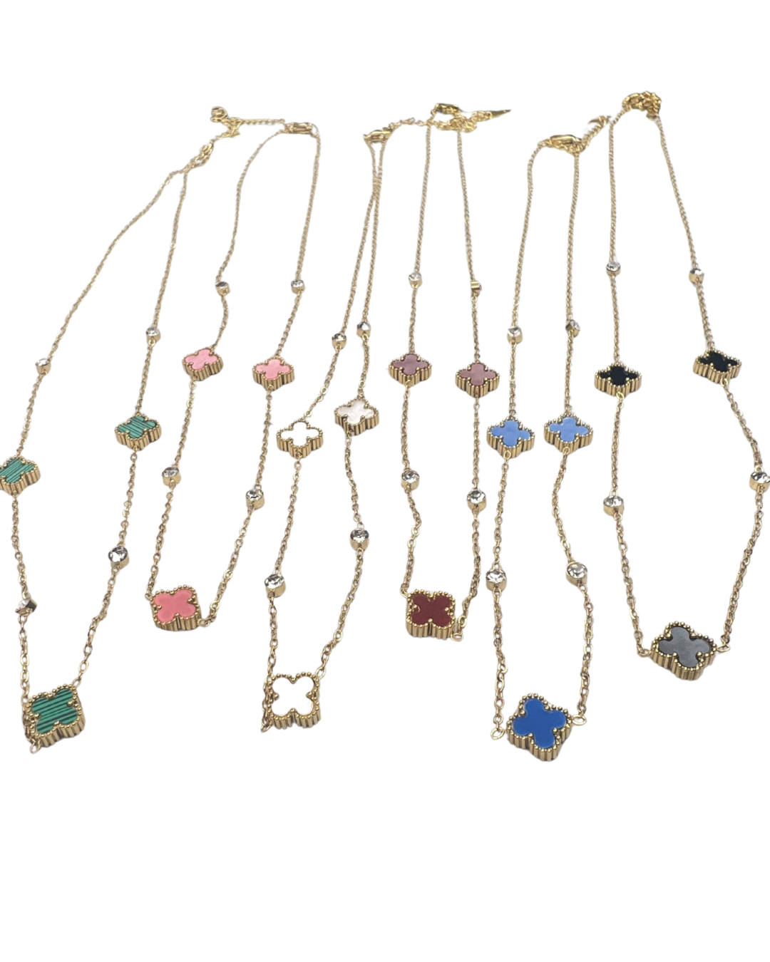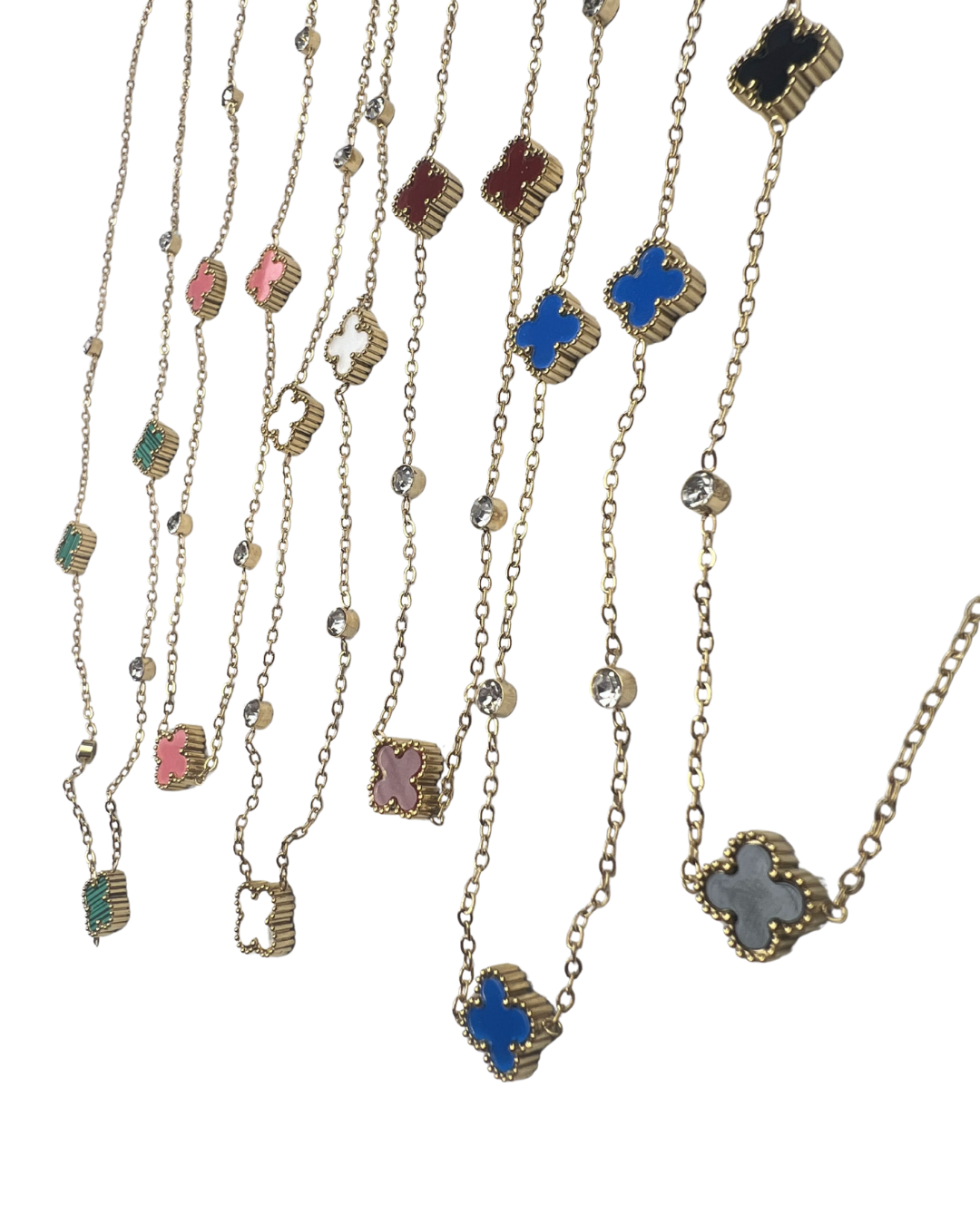 Elegant gold-tone chain necklace with clover-shaped pendant motifs in six unique color finishes.