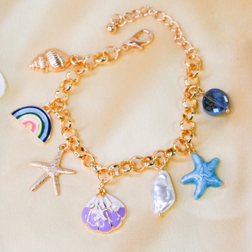 A dreamy coastal-themed charm bracelet featuring seashells, starfish, pearls, and ocean-inspired accents.