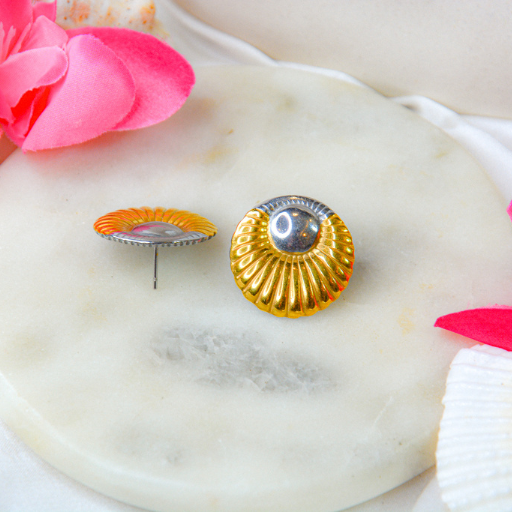 Dual Aura Dome Studs blend vintage charm with modern dual-tone elegance. The bottom half features a gilded, ridged fan that catches light beautifully, while the top is finished in a smooth silver dome for a clean, contemporary contrast. Compact yet eye-catching, these studs are perfect for adding quiet luxury to both everyday looks and polished evening outfits.