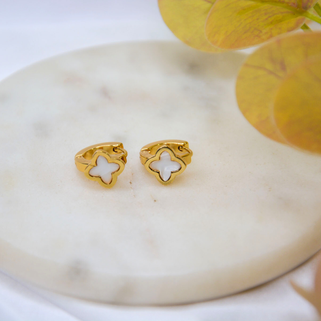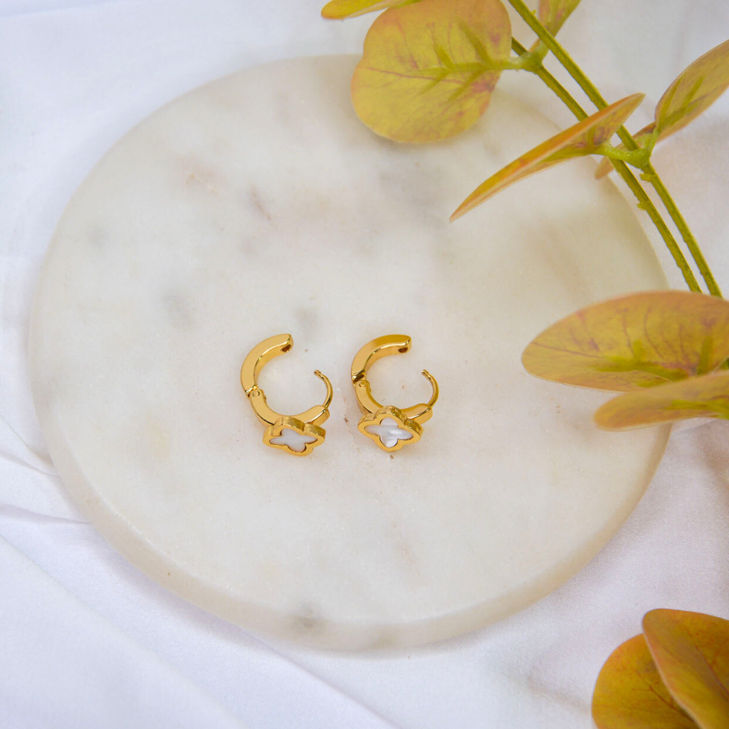Dainty clover-shaped gold hoop earrings – a minimal, chic accessory that adds a hint of luck and charm to your look.