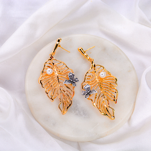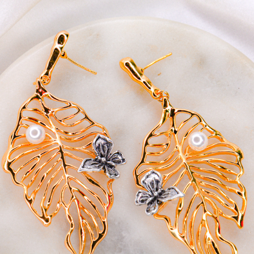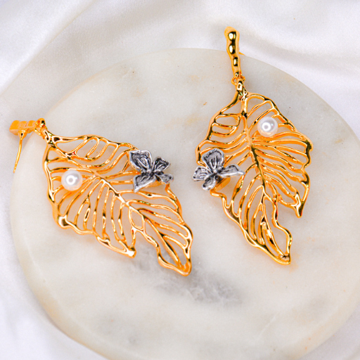 The Golden Leafwing Pearl Earrings bring together whimsical detailing with elegant craftsmanship. The openwork leaf silhouette is finished in rich polished gold, creating a soft, flowing shape that moves beautifully. A tiny silver butterfly sits gently on the leaf, paired with a single luminous pearl—adding charm, contrast, and sophistication. Lightweight yet eye-catching, this pair is perfect for nature-inspired elegance with a luxury finish.
