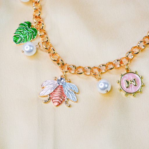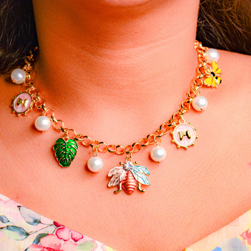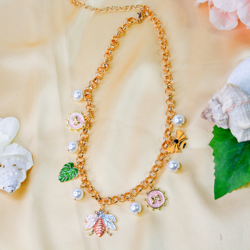 A nature-kissed charm necklace featuring pearls, enamel motifs, and a luxe honey-themed centrepiece for a sweet yet elegant look.