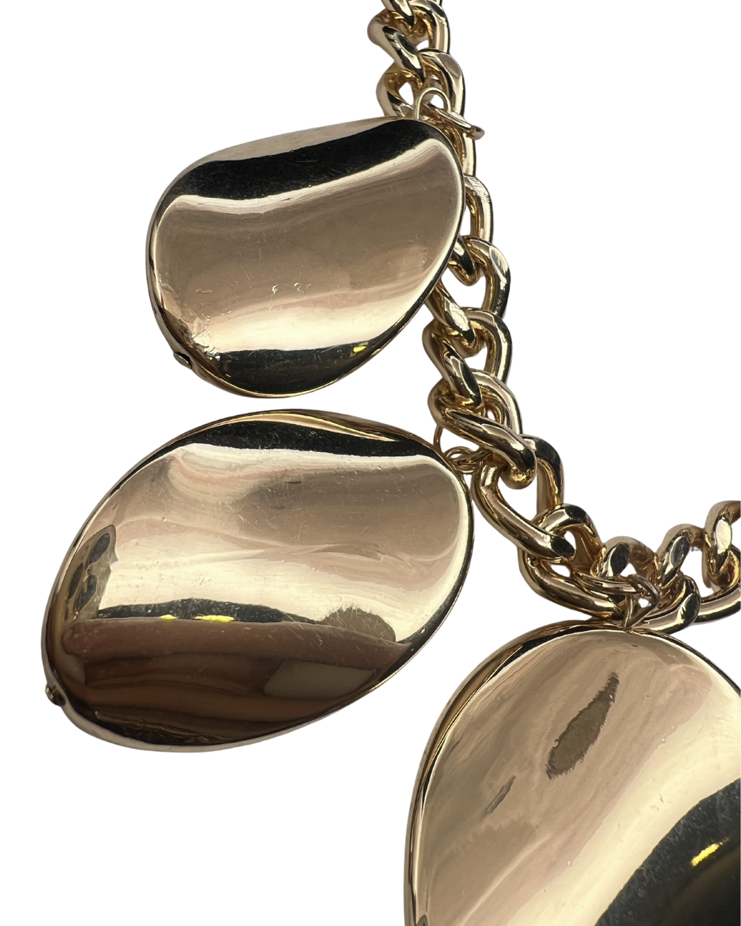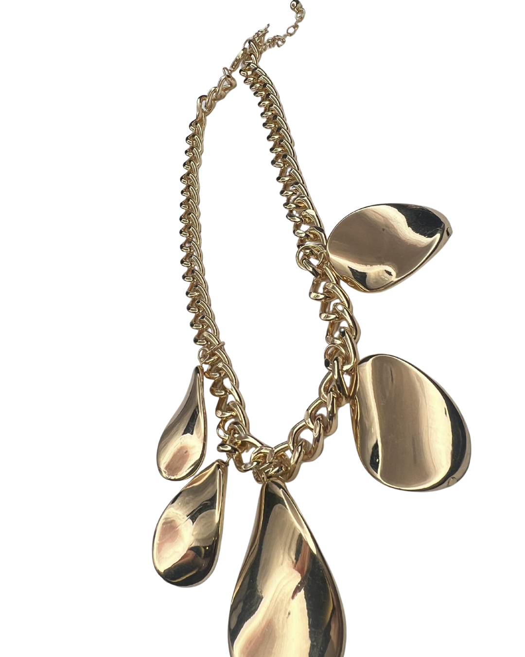 Bold gold‑tone chain set with oversized molten‑effect droplet charms — a high‑impact statement piece.
