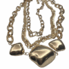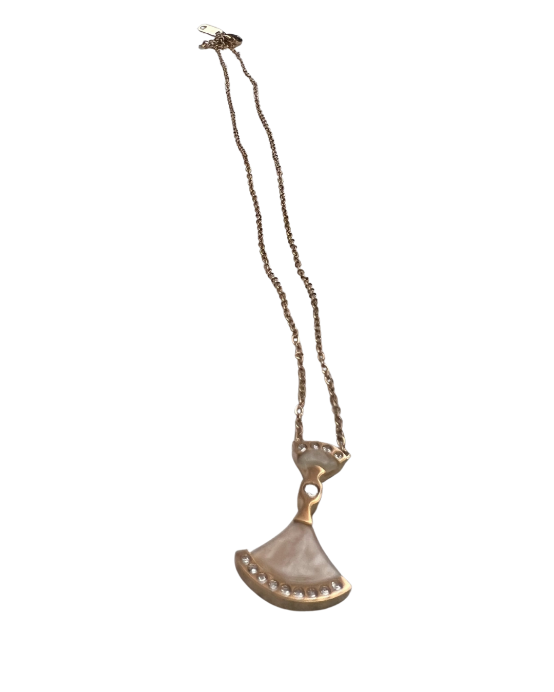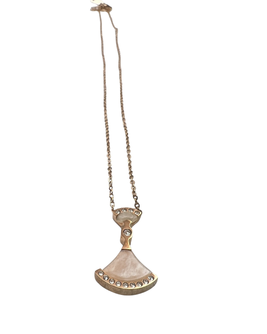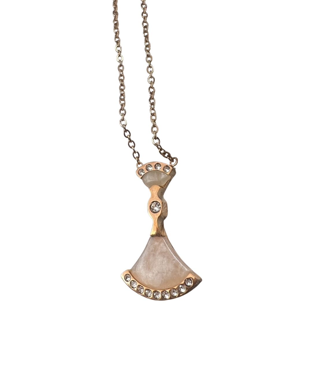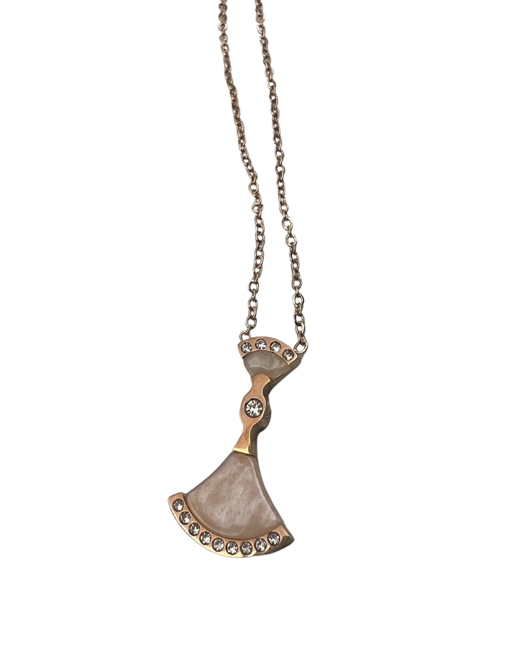 Golden pendant with an hourglass-fan silhouette, accented by shimmering stones.