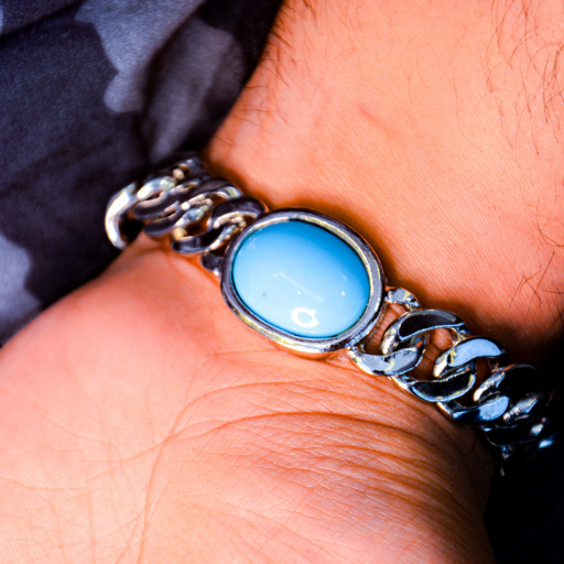 A rugged men’s bracelet featuring a bold aqua stone centerpiece set on a heavyweight metal chain—built for strength, style, and everyday dominance.