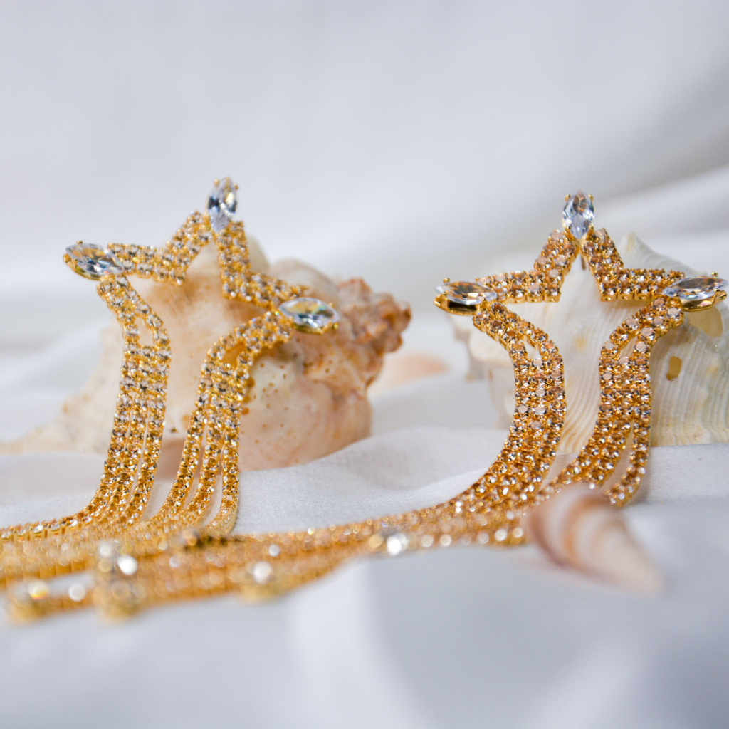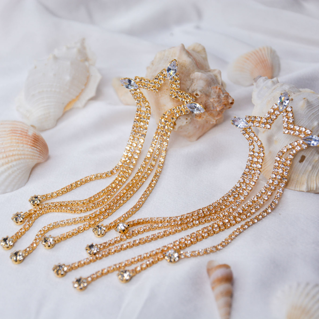 Gold-tone statement earrings in a radiant star shape with cascading crystal trails that sparkle beautifully with every move.