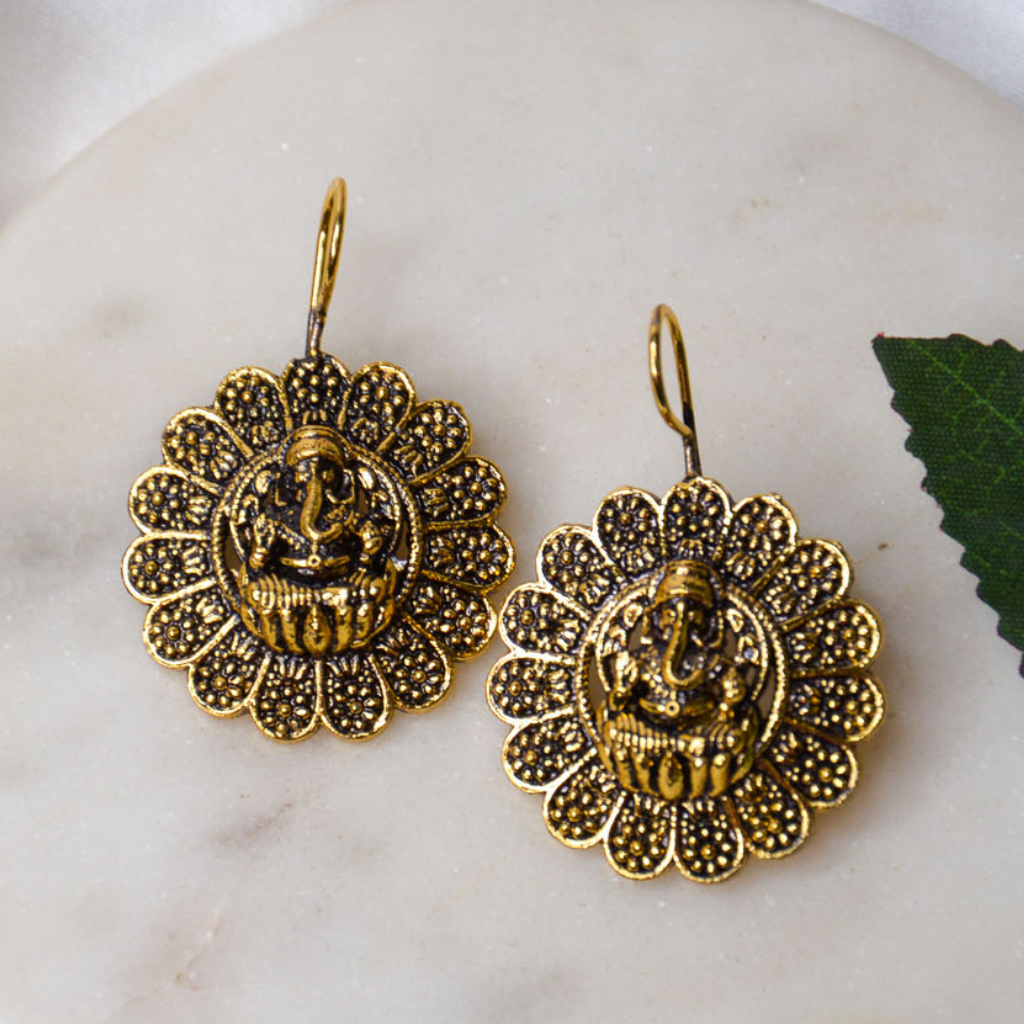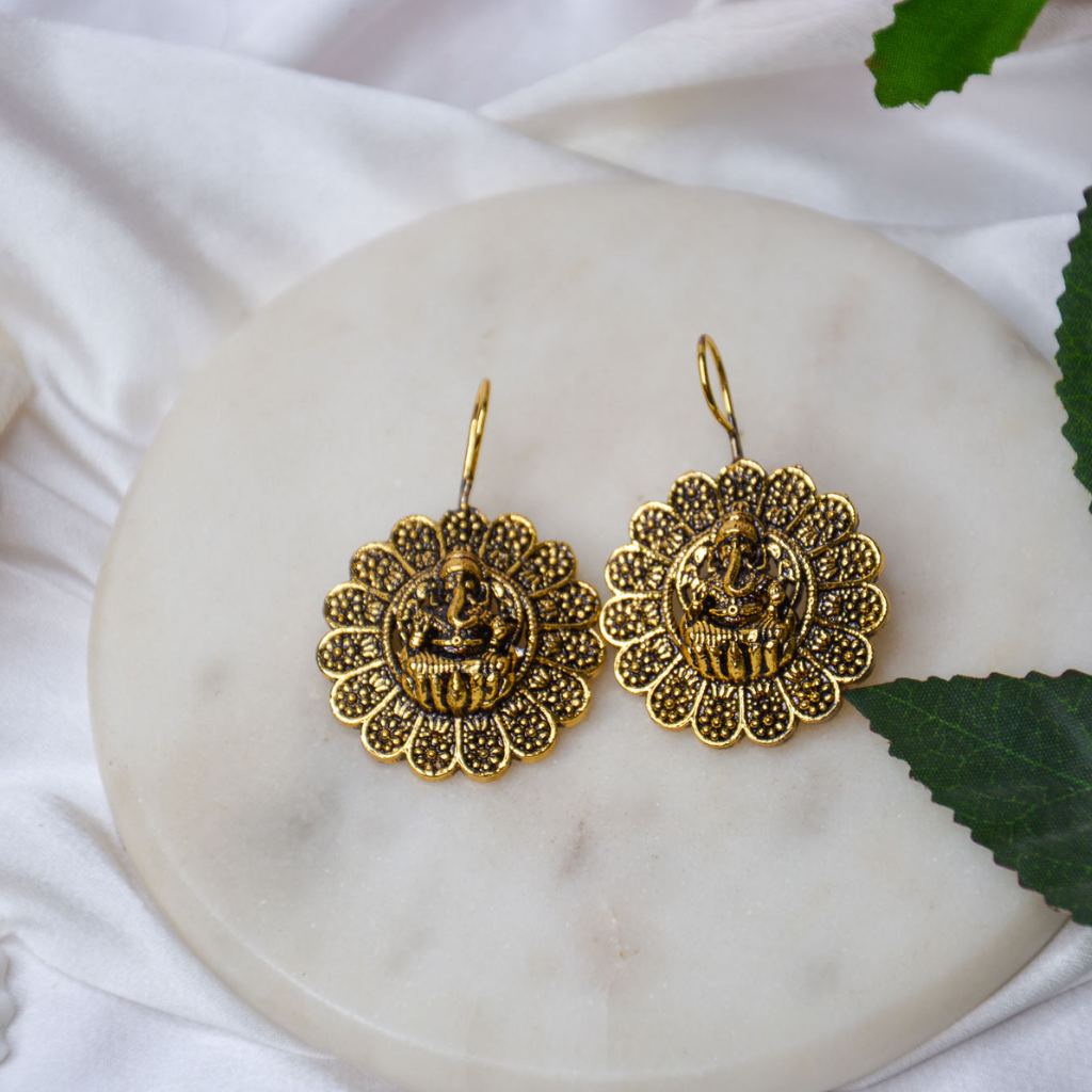 Gold-tone temple earrings featuring a Ganesha motif within a sacred mandala design.